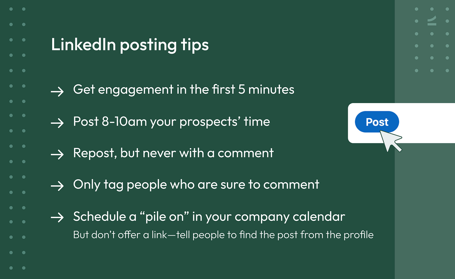 Also pay attention to the AI citations you see when asking AI about your space. Take note of any writers or influencers with a preexisting following. Consider hiring them as a content strategist or expert contributor. “Clay did a great job of this. I didn’t know who Clay was a year and a half ago and now they’re everywhere,” says Sydney. “They hired like 75 influencers for a two-month period and completely drowned LinkedIn. Everywhere you looked, people were talking about Clay.”