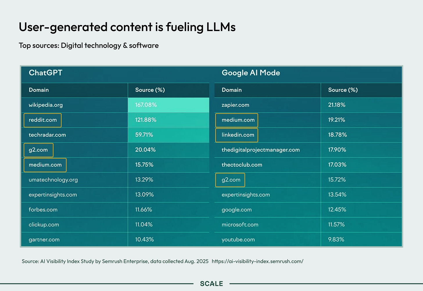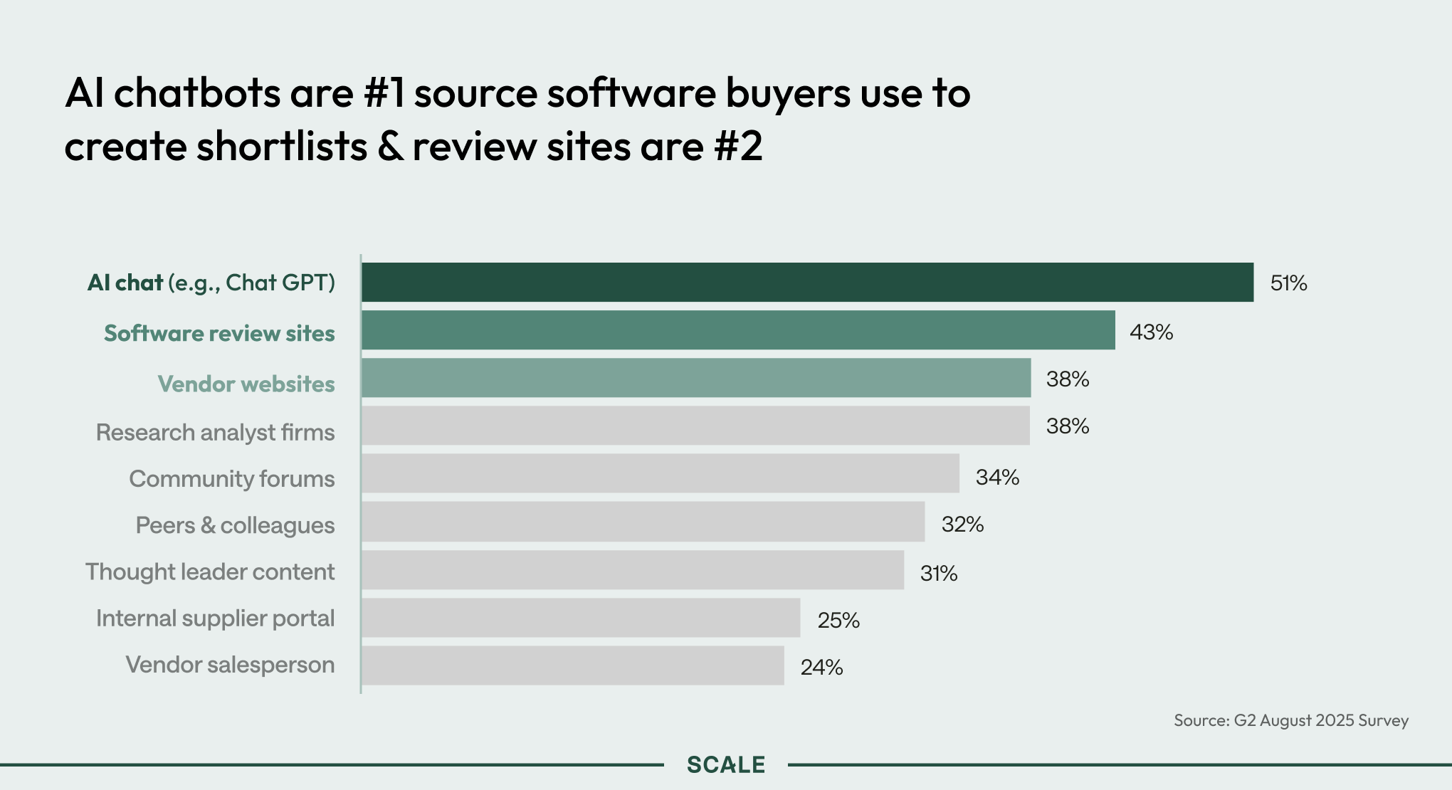 In G2’s survey, buyers say their number two source for unbiased information is software review sites. LLMs feel the same. AI search tools like ChatGPT and Claude rely heavily on forums, review sites, and self-publishing platforms like Medium. This creates a clear directive for marketers: If you want to be found in AI search, encourage more user-generated articles and reviews. “Only 5% of G2’s customers use an in-app review popup, yet they are all leaders. So, founders, don’t be nervous about putting questions in your product,” says Sydney. “Ask them for a review at moments of success. For example, the Vanta team asks for a review when someone gets their SOC 2 compliance. That’s ideal.”