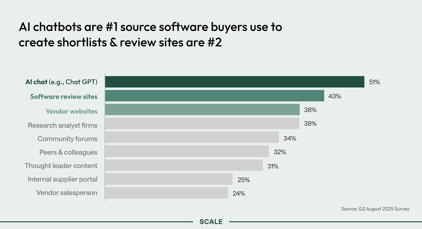 Increasingly, LLMs are the front door to B2B buyer research. Marketers can expect less and less organic and paid traffic from other sources, but it’s not an all-or-nothing switch. This is simply about reallocating resources from your existing programs to what’s becoming the dominant way for buyers to shortlist vendors.