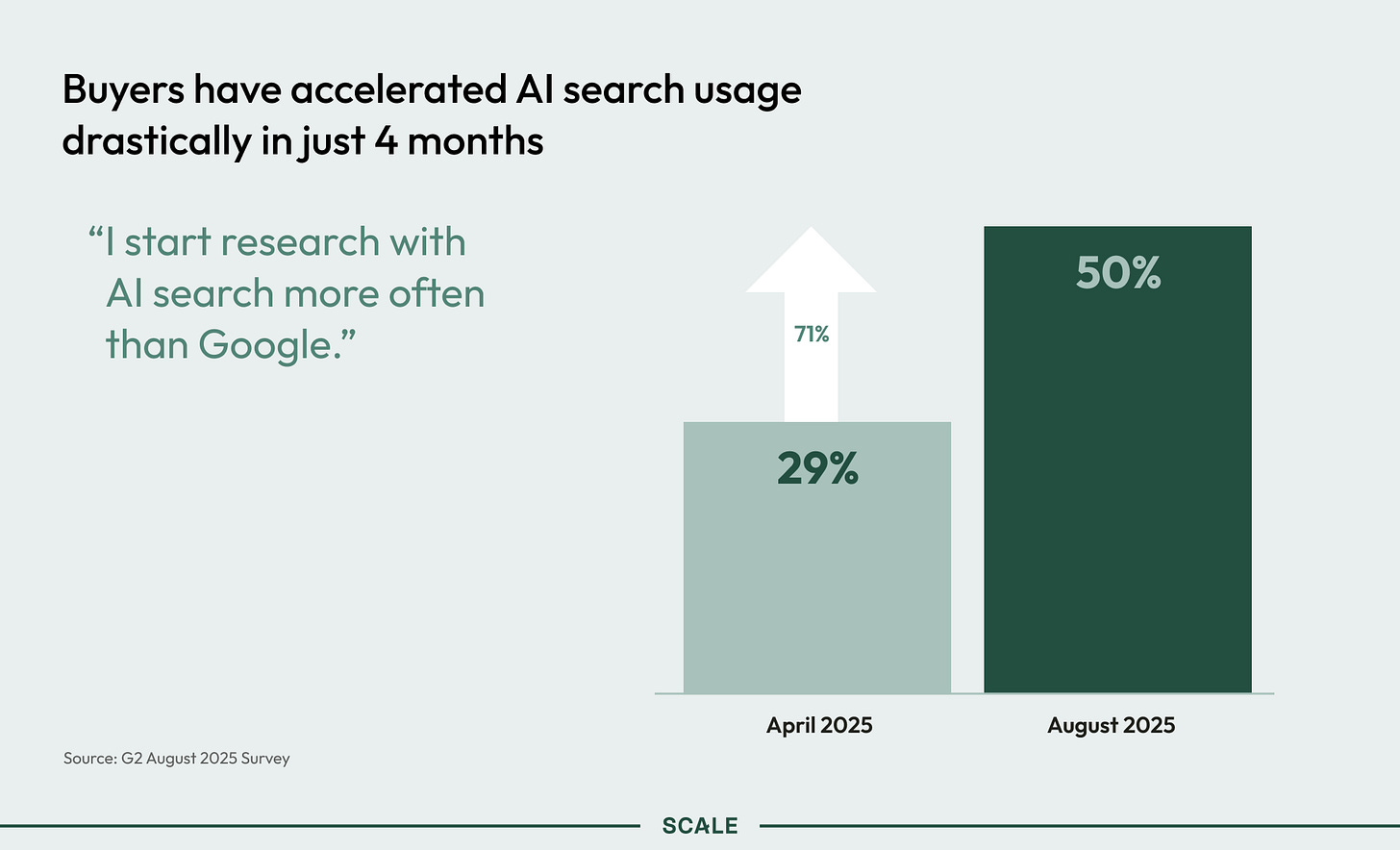 LLMs set a land-speed record as the fastest-spreading work technology ever. Fifty percent of B2B software buyers say they’re more likely to start their search on LLMs rather than Google, according to a G2 survey of 2,000 companies. That’s up from 29% four months prior. Sydney feels confident it will continue to rise.